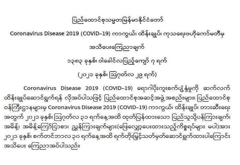 အကောက်ခွန်ဦးစီးဌာနအနေဖြင့် ကိုဗစ်-၁၉ ရောဂါ ကာကွယ် ထိန်းချုပ် ကုသရေးဆေးနှင့် ပစ္စည်းများကို လေကြောင်း၊ ဆိပ်ကမ်း၊ နယ်စပ်ဂိတ်အသီးသီး မှ ရုံးပိတ်ရက်ရှည်ကာလအတွင်း နေ့စဉ်ရုံးပိတ်ရက်မရှိ လွယ်ကူချောမွေ့စွာ စစ်ဆေးထုတ်ပေး လျက်ရှိသည်။