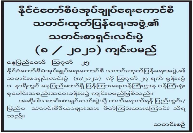 ၂၀၂၁ ခုနှစ် အောက်တိုဘာလမှ ၂၀၂၂ ခုနှစ် မတ်လအထိ (၆)လအတွက် ပြည်ထောင်စု၏ အရအသုံး ခန့်မှန်းခြေငွေစာရင်းများ တင်ပြခြင်းဆိုင်ရာ ညှိနှိုင်း အစည်းအဝေးကို ယနေ့မွန်းလွဲပိုင်းတွင် နေပြည်တော်ရှိ နိုင်ငံတော်စီမံအုပ်ချုပ်ရေးကောင်စီ ဥက္ကဋ္ဌရုံး အစည်းအဝေးခန်းမ၌ကျင်းပရာ ဘဏ္ဍာရေးဆိုင်ရာကော်မရှင် ဒုတိယဥက္ကဋ္ဌ၊ နိုင်ငံတော် စီမံအုပ်ချုပ်ရေးကောင်စီ ဒုတိယဥက္ကဋ္ဌ၊ ဒုတိယဝန်ကြီးချုပ် ဒုတိယ ဗိုလ်ချုပ်မှူးကြီး စိုးဝင်း တက်ရောက် အမှာစကား ပြောကြားသည်။