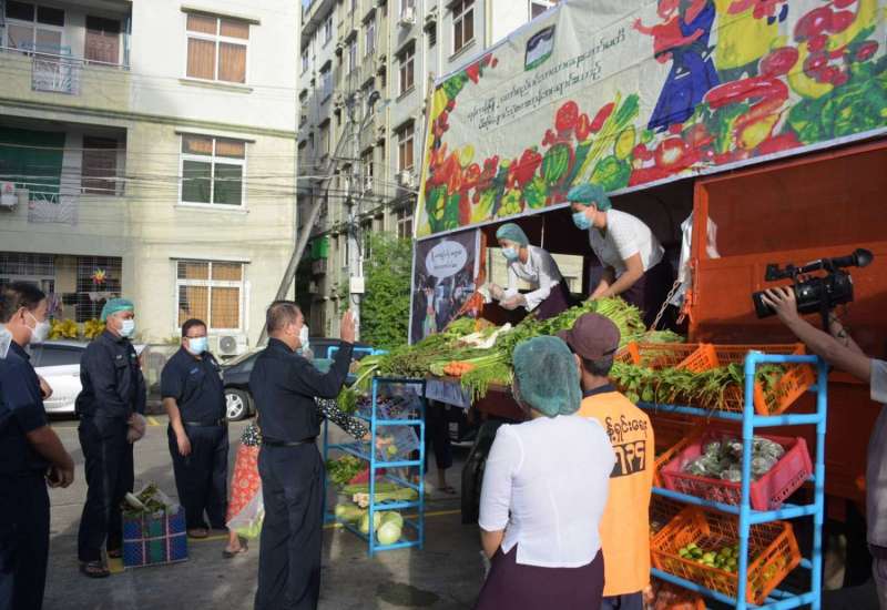 ရန်ကုန်တိုင်းဒေသကြီး စည်ပင်သာယာရေးဝန်ကြီး၊ ရန်ကုန်မြို့တော်စည်ပင်သာယာရေး ကော်မတီ၊ ဥက္ကဋ္ဌ(မြို့တော်ဝန်) ဦးဗိုလ်ဌေးသည် ယနေ့နံနက် ၇ နာရီတွင် ရန်ကင်းမြို့နယ်၊ (၈)ရပ်ကွက်၊ နှင်းဆီလမ်းရှိ ကံဘဲ့စည်ပင်အိမ်ရာဝင်း၌ ရွေ့လျားဈေးကား (Mobile Market) စနစ်ဖြင့် ကုန်စိမ်းများ၊ မီးဖိုချောင်သုံး ကုန်ခြောက်မျိုးစုံ၊ အသားမျိုးစုံနှင့် ငါး/ပုဇွန်အမျိုးမျိုးတို့ကို ဝန်ထမ်းမိသားစုများ ဈေးနှုန်းသက်သာစွာ စားသုံးနိုင်စေရန်၊ ကျန်းမာရေးဝန်ကြီးဌာနမှ ထုတ်ပြန်ထားသော ကိုဗစ်-၁၉ ရောဂါ ထိန်းချုပ်ရေး ညွှန်ကြားချက်များအား လိုက်နာ ဆောင်ရွက်နိုင်ရန် လိုက်လံကြည့်ရှုကြပ်မတ် စစ်ဆေးသည်။