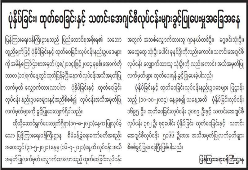 စီးပွားရေးနှင့်ကူးသန်းရောင်းဝယ်ရေး ဝန်ကြီးဌာနအနေဖြင့် ကိုဗစ်-၁၉ ကာကွယ်၊ ထိန်းချုပ်၊ ကုသရေးဆိုင်ရာပစ္စည်းများကို အများပြည်သူရုံးပိတ်ရက်များတွင် လေကြောင်း၊ ရေကြောင်းနှင့် နယ်စပ်ကုန်သွယ်ရေးစခန်းများမှ စဉ်ဆက်မပြတ် အဆင်ပြေချောမွေ့စွာ တင်သွင်းနိုင်ရေးအတွက် ပိတ်ရက်မရှိ စီစဉ်ဆောင်ရွက်ပေးလျက်ရှိရာ ဩဂုတ် ၈ ရက်တွင် ရန်ကုန်အပြည်ပြည်ဆိုင်ရာ လေဆိပ်မှ Oxygen Concentrator (၆၃၅) ခု၊ Test Kit (၁၀၀၀) ၊ PPE ဝတ်စုံ (၄၄၀) နှင့် ဆိပ်ကမ်းများမှ အောက်ဆီဂျင် (အရည်)အိုး (၁) တန်၊ အောက်ဆီဂျင် (အိုးခွံ) (၆၁) လုံးအပါအဝင် မူဆယ်၊ ချင်းရွှေဟော်၊ မြဝတီ ၊ ကော့သောင်း၊ ထီးခီး၊ ကန်ပိုက်တီ၊ လွယ်ဂျယ် ကုန်သွယ်ရေး စခန်းများမှ အောက်ဆီဂျင်(အရည်) Bowserယာဉ်(၂)စီးဖြင့် (၃၉) တန်၊ အောက်ဆီဂျင် (အရည်) အိုးဖြင့် (၁၇) တန်၊ အောက်ဆီဂျင် (ဓာတ်ငွေ့) အိုးဖြင့် (၀ ဒသမ ၀၇) တန်၊ အောက်ဆီဂျင်အိုး(အခွံ) (၅၉၁၇)ခု၊ အိမ်သုံးအောက်ဆီဂျင်စက် (Oxygen Concentrator) (၉၃၉) ခု၊ Covid Test Kit (၄၀၀၀) ၊ PPE ဝတ်စုံ (၈၈၁၀) နှင့် နှာခေါင်းစည်း(Mask) (၇၃) တန် တင်သွင်းနိုင်ခဲ့သည်။ အထက်ပါ ပစ္စည်းများကို ကုမ္ပဏီ (၂၁) ခုမှ ယာဉ်စီးရေ (၅၀) ဖြင့် တင်သွင်းခဲ့ခြင်းဖြစ်သည်။