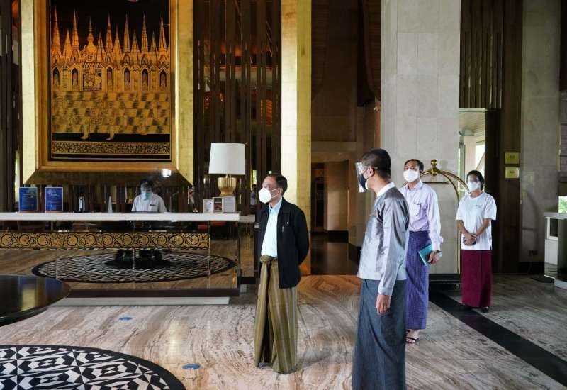 ဟိုတယ်နှင့်ခရီးသွားလာရေးဝန်ကြီးဌာန၊ ပြည်ထောင်စုဝန်ကြီး ဒေါက်တာဌေးအောင်သည် ယနေ့ မွန်းလွဲပိုင်းတွင် ကျန်းမာရေးဝန်ကြီးဌာနမှ ထုတ်ပြန်ထားရှိသည့် ကိုဗစ်-၁၉ ကာကွယ်၊ ထိန်းချုပ်ရေးဆိုင်ရာ စည်းမျဉ်းစည်းကမ်းများနှင့်အညီ ဖွင့်လှစ်ဆောင်ရွက်လျက်ရှိသည့် နေပြည်တော် ကောင်စီနယ်မြေ၊ ဒက္ခိဏသီရိမြို့နယ်ရှိ နိုင်ငံတော်ဧည့်ဂေဟာ ဟိုတယ်များကို ကြည့်ရှုသည်။