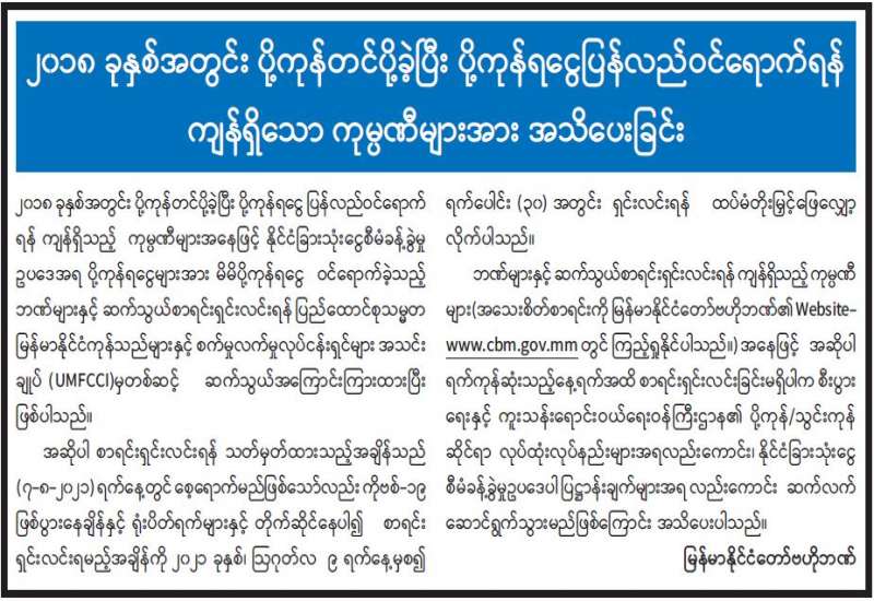 မြန်မာနိုင်ငံသတင်းမီဒီယာကောင်စီဝင် ရွေးချယ်တင်မြှောက်ပွဲကို စက်တင်ဘာ ၇ ရက်တွင် ကျင်းပသွားမည်ဖြစ်ကြောင်း မြန်မာနိုင်ငံသတင်းမီဒီယာကောင်စီဝင် ရွေးချယ်တင်မြှောက်ရေး အဖွဲ့က ယနေ့တွင် အသိပေးကြေညာထားသည်။