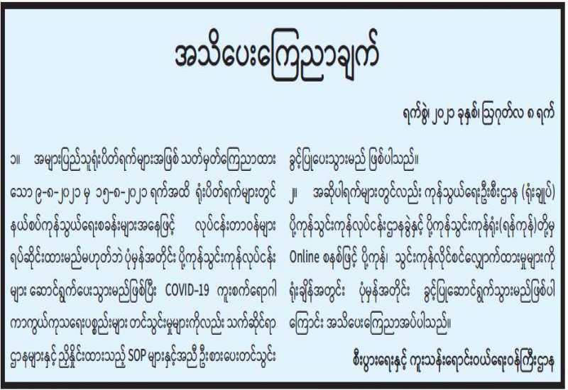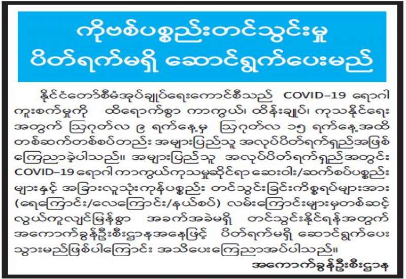 အကောက်ခွန်ဦးစီးဌာနအနေဖြင့် ကိုဗစ်-၁၉ရောဂါ ကာကွယ်၊ ထိန်းချုပ်၊ ကုသရေးဆေးနှင့် ပစ္စည်းများကို လေကြောင်း၊ ဆိပ်ကမ်း၊ နယ်စပ်ဂိတ်အသီးသီးမှ ရုံးပိတ်ရက်ရှည် ကာလအတွင်း နေ့စဉ်ရုံးပိတ်ရက်မရှိ လွယ်ကူ