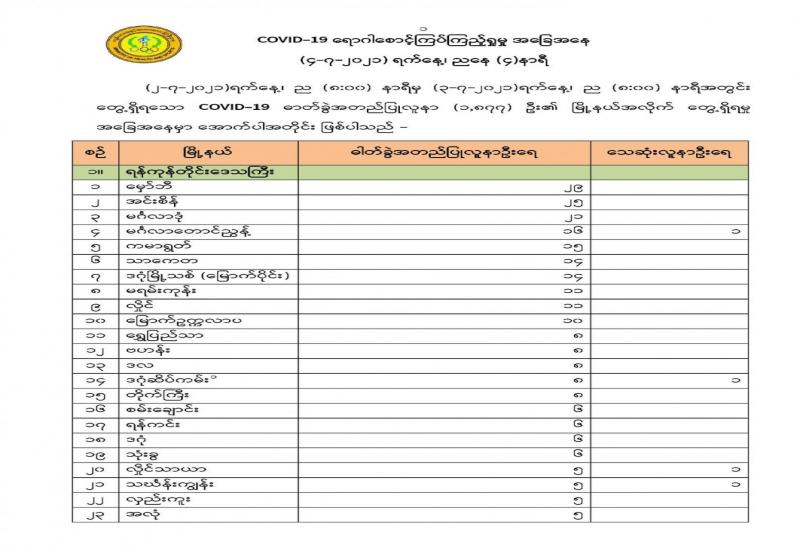 (၃-၇-၂၀၂၁) ရက်နေ့၊ ည (၈:၀၀) နာရီမှ (၄-၇-၂၀၂၁) ရက်နေ့၊ ည (၈:၀၀) နာရီအတွင်း ဓာတ်ခွဲနမူနာ စုစုပေါင်း (၁၀,၃၇၈)ခုအား စစ်ဆေးပြီးစီးခဲ့ရာ COVID-19 ရောဂါ ဓာတ်ခွဲအတည်ပြု လူနာသစ် (၂,၃၁၈) ဦး တွေ့ရှိရပါသည်။ သို့ဖြစ်ပါ၍ ယနေ့အထိ ဓာတ်ခွဲနမူနာ စုစုပေါင်း (၂,၇၇၂,၃၆၁) ခု အား စစ်ဆေးခဲ့ပြီး COVID-19 ဓာတ်ခွဲအတည်ပြုလူနာ စုစုပေါင်း (၁၆၅,၄၀၅) ဦး ရှိပြီ ဖြစ်ပါသည်။