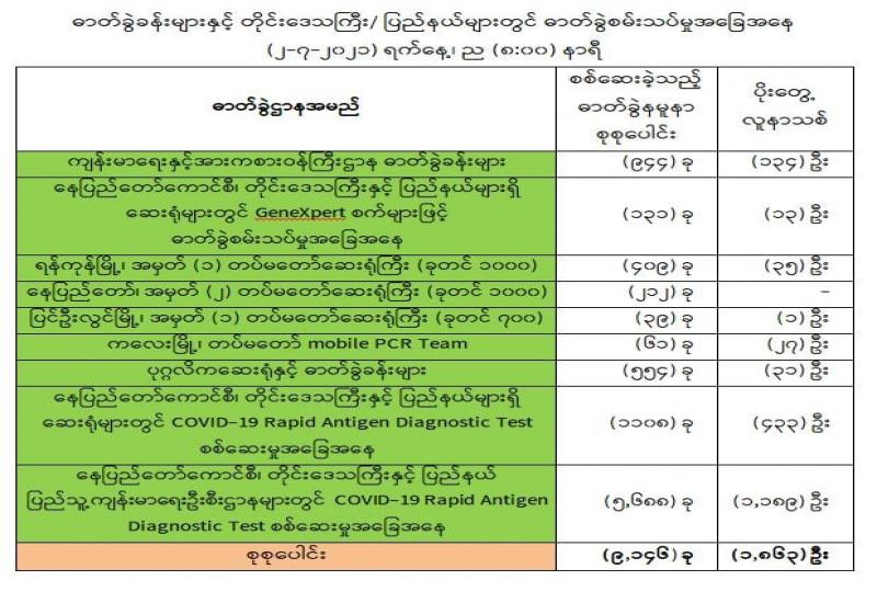 (၁-၇-၂၀၂၁) ရက်နေ့၊ ည (၈:၀၀) နာရီမှ (၂-၇-၂၀၂၁) ရက်နေ့၊ ည (၈:၀၀) နာရီအတွင်း ဓာတ်ခွဲနမူနာစုစုပေါင်း (၉,၁၄၆) ခုအား စစ်ဆေးပြီးစီးခဲ့ရာ COVID-19 ရောဂါ ဓာတ်ခွဲအတည်ပြု လူနာသစ် (၁,၈၆၃) ဦး တွေ့ရှိရပါသည်။ သို့ဖြစ်ပါ၍ ယနေ့အထိ ဓာတ်ခွဲနမူနာစုစုပေါင်း (၂,၇၅၂,၉၂၉)ခု အား စစ်ဆေးခဲ့ပြီး COVID-19 ဓာတ်ခွဲအတည်ပြုလူနာ စုစုပေါင်း (၁၆၁,၂၁၀) ဦး ရှိပြီ ဖြစ်ပါသည်။