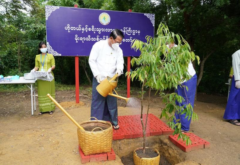 ဟိုတယ်နှင့်ခရီးသွားလာရေးဝန်ကြီးဌာန၏ ၂၀၂၁ ခုနှစ် ပတ်ဝန်းကျင်စိမ်းလန်းစိုပြေရေး လှုပ်ရှားမှု မိုးရာသီသစ်ပင်စိုက်ပျိုးပွဲအခမ်းအနားကို ယနေ့နံနက် ၉ နာရီတွင် နေပြည်တော်ရှိ ဟိုတယ်နှင့်ခရီးသွားလာရေးဝန်ကြီးဌာန၊ ပျိုးဥယျာဉ်အနီး၌ ကျင်းပရာ ပြည်ထောင်စုဝန်ကြီး ဦးမောင်မောင်အုန်းနှင့်ဇနီး တက်ရောက်၍ ကံ့ကော်ပင်အား ဦးဆောင်စိုက်ပျိုးပေးသည်။