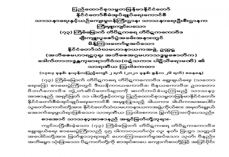 ပြည်ထောင်စုသမ္မတမြန်မာနိုင်ငံတော်၊ သာသနာရေးနှင့် ယဉ်ကျေးမှုဝန်ကြီးဌာနက ကြီးမှူးကျင်းပသည့်(၇၃)ကြိမ်မြောက် တိပိဋကဓရ တိပိဋကကောဝိဒရွေးချယ်ရေး စာမေးပွဲ တွင် သဘောရေးဖြေအောင်မြင်တော်မူကြသော ဒီဃနိကာယကောဝိဒ၊ ဝိနယကောဝိဒနှင့် ဥဘတောဝိဘင်္ဂကောဝိဒ ဘွဲ့တံဆိပ်တော်ရ သာသနာ့အာဇာနည် အရှင်မြတ်များအား ဘွဲ့တံ ဆိပ်တော်နှင့်အောင်လက်မှတ်ဆက်ကပ်ချီးကျူးပူဇော်ပွဲ မဟာမင်္ဂလာ အခမ်းအနားကို ယနေ့ နံနက် ၈ နာရီတွင်ရန်ကုန်တိုင်းဒေသကြီး၊ မရမ်းကုန်း မြို့နယ်၊ ကမ္ဘာအေးကုန်းမြေရှိ မဟာ ပါသာဏလိုဏ်ဂူသိမ်တော်ကြီး၌ ကျင်းပပြု လုပ်သည်။
