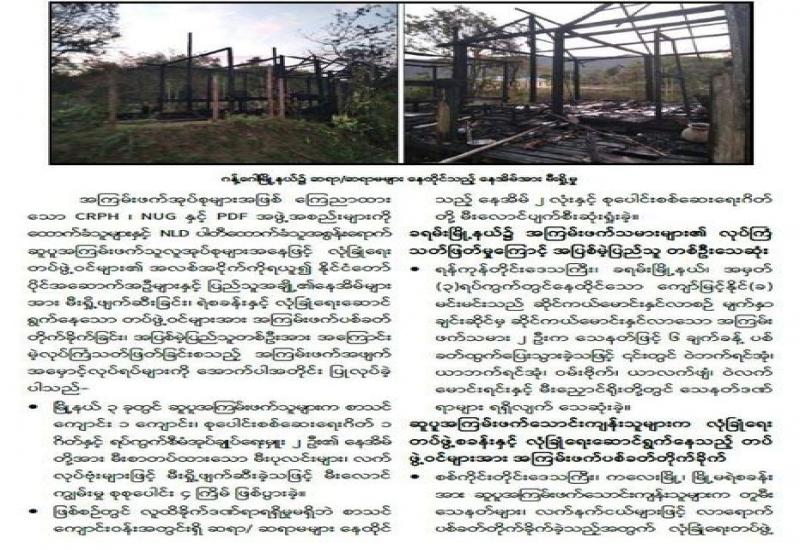 မြန်မာနိုင်ငံအတွင်း အကြမ်းဖက်တိုက်ခိုက်မှုဖြစ်စဉ်များ ဖြစ်ပွားမှုမရှိစေရေးအတွက် လုံခြုံရေးတပ်ဖွဲ့ဝင်များက လိုအပ်သည့်စုံစမ်းဖော်ထုတ်မှုများ ဆောင်ရွက်လျက်ရှိရာ အကြမ်းဖက် သမားများ၏ လက်နက်၊ ခဲယမ်းများ၊ ဖောက်ခွဲရေးပစ္စည်းများနှင့် ဆက်စပ်ပစ္စည်းများကို ဆက်လက် ဖော်ထုတ်သိမ်းဆည်းရမိလျက်ရှိသည်။