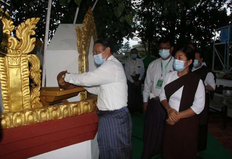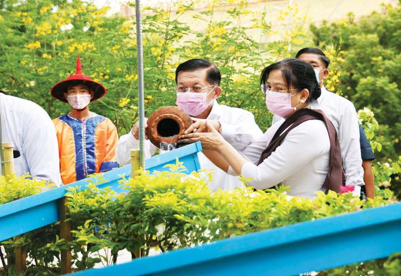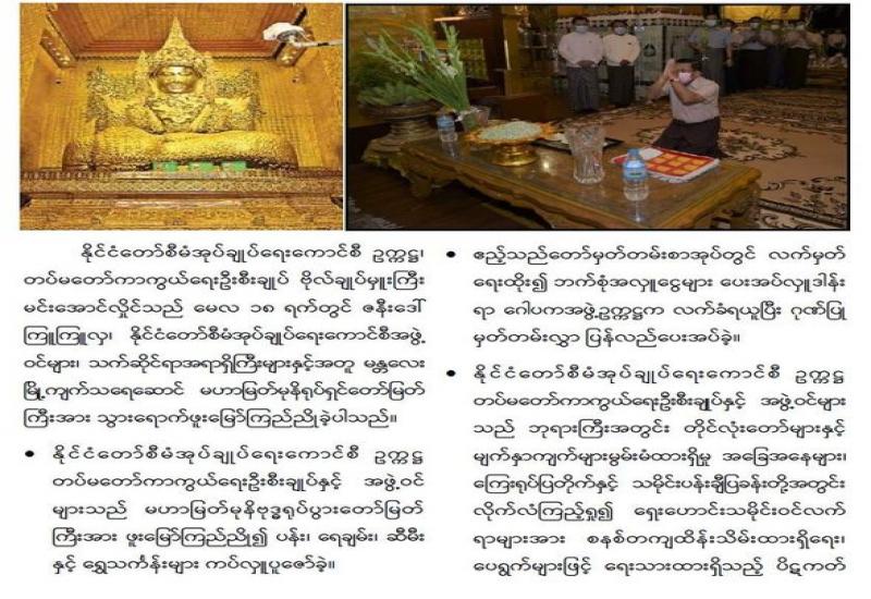 ဗုဒ္ဓဘာသာမြန်မာလူမျိုးတို့၏ ၁၂ လရာသီပွဲတော်တွင် တစ်ခုအပါအဝင်ဖြစ်သည့် မြန်မာသက္ကရာဇ် ၁၃၈၃ ခုနှစ်၊ ကဆုန်လပြည့်ဗုဒ္ဓနေ့ဖြစ်သော ယနေ့တွင်ကျရောက်သည့် ကဆုန်ညောင်ရေသွန်းပွဲတော်တွင် နေပြည်တော်၊ ဥပ္ပါတ သန္တိစေတီတော်မြတ်ကြီး ပရိဝုဏ်တော်မြောက်ဘက်အရပ်ရှိ မဟာဗောဓိညောင်ပင်တော်များအား (၁၃)ကြိမ် မြောက် ကဆုန်ညောင်ရေသွန်းလောင်း ပူဇော်ခြင်း မဟာမင်္ဂလာအခမ်းအနားအား ယနေ့ညနေပိုင်း၌ ကျင်းပပြုလုပ်ရာ နိုင်ငံတော်စီမံအုပ်ချုပ်ရေးကောင်စီဥက္ကဋ္ဌ တပ်မတော်ကာကွယ်ရေး ဦးစီးချုပ် ဗိုလ်ချုပ်မှူးကြီး မင်းအောင်လှိုင်နှင့်ဇနီး ဒေါ်ကြူကြူလှတို့က မဟာဗောဓိ ညောင်ပင်များကို ညောင်ရေသွန်း လောင်း ပူဇော်ကြ သည်။