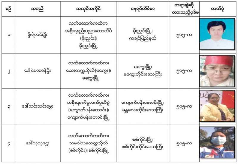 နိုင်ငံတော်၏အုပ်ချုပ်မှုယန္တရားပျက်ပြားစေရန် ရည်ရွယ်ချက်ဖြင့် နိုင်ငံ့ဝန်ထမ်း များနှင့် ကျန်းမာရေး ဝန်ထမ်းများအား CDM လှုပ်ရှားမှုများတွင် ပါဝင်လာစေရန် လှုံ့ဆော်ခြင်း၊ ၎င်းတို့ကိုယ်တိုင် CDM လှုပ်ရှား မှုများတွင် ပါဝင်လုပ်ဆောင်ခြင်း၊ CDM လှုပ်ရှားမှုအပေါ် ထောက်ခံအားပေးခြင်း၊ အကြမ်းဖက်အုပ်စုများအဖြစ် သတ်မှတ် ကြေညာ ထားသည့် CRPH နှင့် NUG တို့အား ထောက်ခံအားပေးခြင်းတို့ကို ဆောင်ရွက် လျက်ရှိသည့် အောက်ဖော် ပြပါ သူနာပြုများအား ရာဇသတ်ကြီးပုဒ်မ ၅၀၅-က ဖြင့် အမှုဖွင့်အရေးယူဆောင်ရွက် ထားပြီးဖြစ် ပါသည်-