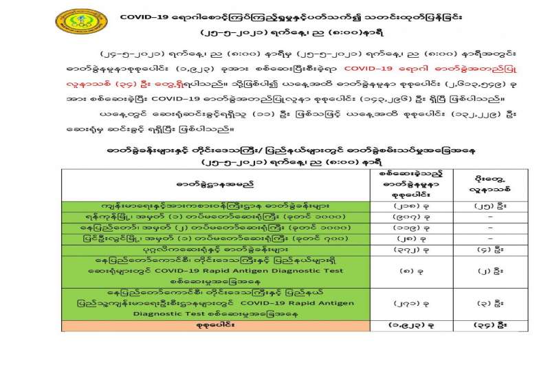 ပြည်သူလူထု၏ ခွဲစိတ်ကုသမှုဆိုင်ရာရောဂါ၊ သွားနှင့်ခံတွင်းရောဂါ၊ အရိုးအကြောရောဂါ၊ အစာအိမ် ရောဂါ၊ မျက်စိရောဂါ၊ နား၊နှာခေါင်း၊ လည်ချောင်း ရောဂါ၊ သားဖွားမီးယပ်ရောဂါ၊ သွေးတိုးရောဂါ၊ နှလုံးရောဂါ၊ အထွေထွေရောဂါတို့နှင့် ပတ်သက်၍ လိုအပ်သည့် ကျန်းမာရေး စောင့်ရှောက်မှု လုပ်ငန်းများ ဆောင်ရွက်ပေး နိုင်ရန်အတွက် အခက်အခဲဖြစ်ပေါ်လျက်ရှိသည့် ဒေသအသီးသီးမှ ဝန်ထမ်းများနှင့် ဒေသခံများ၏ တောင်းဆိုမှုအရ တပ်မတော်မှ ဆေးကုသရေးအဖွဲ့များ စေလွှတ်၍ ဆေးကုသရေး လုပ်ငန်းများကို ဆောင်ရွက်ပေးလျက်ရှိသည်။