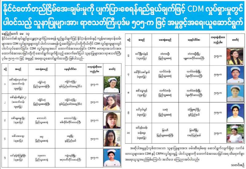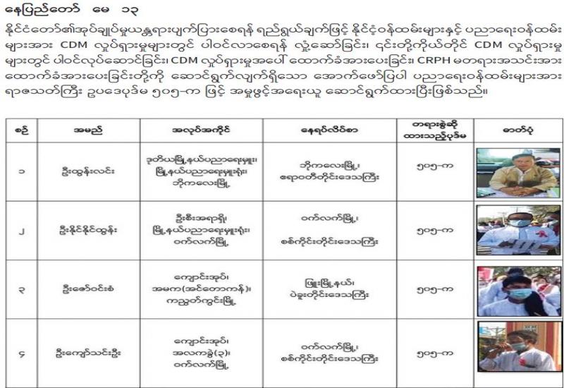 လုံခြုံရေးတပ်ဖွဲ့ဝင်များသည် ဆူပူအကြမ်းဖက်မှုလုပ်ရပ်များတွင် အသုံးပြုမည့် လက်နက်၊ ပစ္စည်း၊ ကိရိယာများအား ဆက်လက် ဖော်ထုတ်သိမ်းဆည်းလျက်ရှိရာ မေ ၁၂ ရက် ညနေ ၄ နာရီ ၄၅ မိနစ်ခန့်တွင် ပဲခူးတိုင်းဒေသကြီး၊ ညောင်လေးပင်မြို့နယ်၊ သရက်ကုန်းကျေးရွာနေ စံထူး (၄၂)နှစ် (ဘ)ဦးအေးမောင်ကို အကြမ်းဖက်ရာတွင် အသုံးပြုသည့် ပစ္စည်းများနှင့် လည်းကောင်း၊ ညနေ ၆ နာရီခွဲခန့်တွင် စစ်ကိုင်းတိုင်းဒေသကြီး၊ ကျွန်းလှမြို့၊ သစ်ရာမြိုင် ရပ်ကွက်နေ ဇော်ဇော်အောင် (၁၉)နှစ် (ဘ)ဦးတင်စိုးကို လက်လုပ်သေနတ် ၁ လက်၊ ဆက်စပ် ပစ္စည်းများနှင့် လည်းကောင်း ဖမ်းဆီးရမိခဲ့သည်။