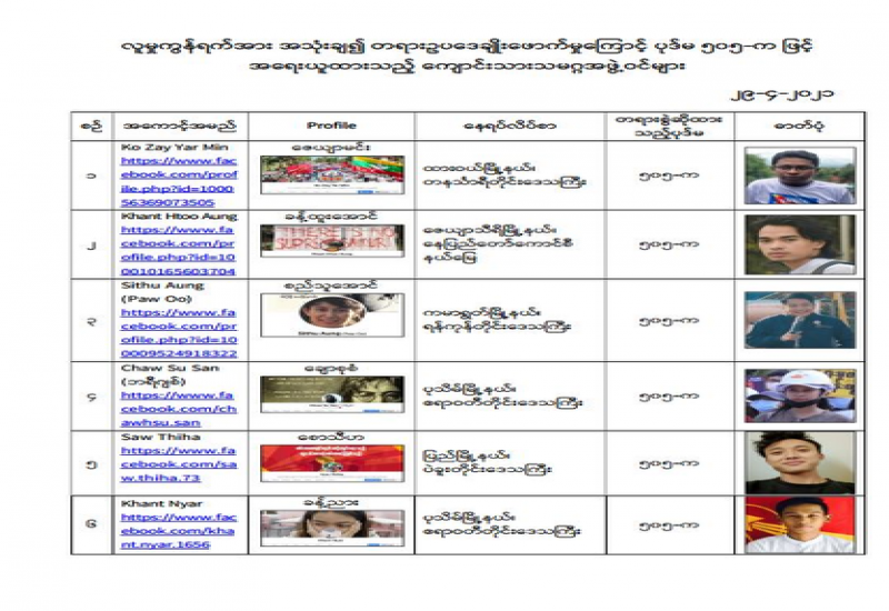 ၁။ နိုင်ငံတော်၏အုပ်ချုပ်မှုယန္တရား ပျက်ပြားစေရန် ရည်ရွယ်ချက်ဖြင့် နိုင်ငံ့ဝန်ထမ်းများအား CDM လှုပ်ရှားမှုတွင် ပါဝင်စေရန် လှုံ့ဆော်ခြင်း၊ CRPH မတရားအသင်းအား ထောက်ခံသည့် အကြောင်းအရာများ၊ မမှန်သတင်းများအား ဖြန့်ဝေခြင်း၊ နိုင်ငံတော် တည်ငြိမ်အေးချမ်းမှုကို ပျက်ပြားစေပြီး ဆူပူအုံးကြွမှု ဖြစ်ပေါ်စေရန်နှင့် အများပြည်သူ အထိတ်တလန့်ဖြစ်စေရန်အတွက် သွေးထိုး လှုံ့ဆော်မှုများပြုလုပ်ခြင်း၊ Social Punishment ပြုလုပ်ခြင်းများကို လှုမှုကွန်ရက်စာမျက်နှာများတွင် ရည်ရွယ်ချက်ရှိရှိ ဖော်ပြခြင်းနှင့် ဖြန့်ဝေခြင်းများ ဆောင်ရွက်လျက်ရှိသည့် အောက်ပါကျောင်းသားသမဂ္ဂအဖွဲ့ဝင်များနှင့် အခြား ပါဝင်ပတ်သက်သူများအား ရာဇသတ်ကြီး ပုဒ်မ ၅၀၅ - က ဖြင့် အမှုဖွင့် အရေးယူ ဆောင်ရွက်လျက်ရှိကြောင်း ထုတ်ပြန်အပ်ပါသည်။