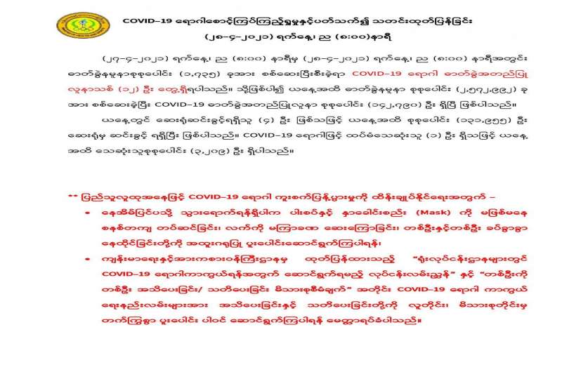 (၂၆-၄-၂၀၂၁) ရက်နေ့၊ ည (၈:၀၀) နာရီမှ (၂၇-၄-၂၀၂၁) ရက်နေ့၊ ည (၈:၀၀) နာရီအတွင်း ဓာတ်ခွဲနမူနာစုစုပေါင်း (၂,၄၄၆) ခုအား စစ်ဆေးပြီးစီးခဲ့ရာ COVID-19 ရောဂါ ဓာတ်ခွဲအတည်ပြု လူနာသစ် (၃၈) ဦး တွေ့ရှိရပါသည်။ သို့ဖြစ်ပါ၍ ယနေ့အထိ ဓာတ်ခွဲနမူနာ စုစုပေါင်း (၂,၅၇၁,၂၅၇) ခု အား စစ်ဆေးခဲ့ပြီး COVID-19 ဓာတ်ခွဲအတည်ပြုလူနာ စုစုပေါင်း (၁၄၂,၇၇၈) ဦး ရှိပြီ ဖြစ်ပါသည်။