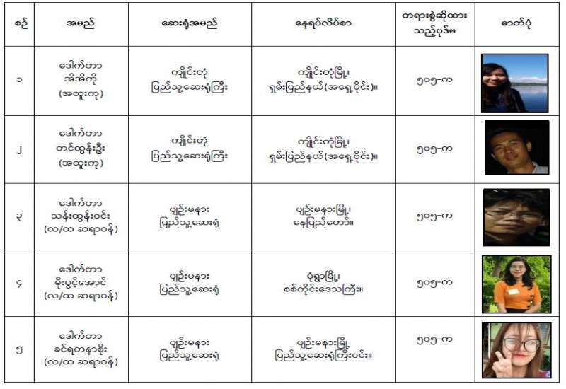 - နိုင်ငံတော်၏ အုပ်ချုပ်မှုယန္တရားပျက်ပြားစေရန် ရည်ရွယ်ချက်ဖြင့် နိုင်ငံ့ဝန်ထမ်းနှင့် ကျန်းမာရေးဝန်ထမ်းများအား CDM လှုပ်ရှားမှုများတွင် ပါဝင်လာစေရန် လှုံ့ဆော်ခြင်း၊ ၎င်းတို့ကိုယ်တိုင် CDM လှုပ်ရှားမှုများတွင် ပါဝင်လုပ်ဆောင်ခြင်း၊ CDM လှုပ်ရှားမှု အပေါ် ထောက်ခံအားပေးခြင်း၊ CRPH မတရားအသင်းအား ထောက်ခံအားပေးခြင်း တို့ကို ဆောင်ရွက်လျက်ရှိသည့် အောက်ဖော်ပြပါ ဆရာဝန်များအား ရာဇသတ်ကြီးပုဒ်မ ၅၀၅-က ဖြင့် အမှုဖွင့်အရေးယူဆောင်ရွက်ထားပြီးဖြစ်ပါသည်။