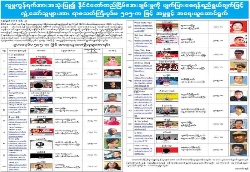 ဆူပူအကြမ်းဖက်မှုကို လိုလားပြီး နိုင်ငံ၏ အုပ်ချုပ်မှုယန္တရားပုံမှန် လည်ပတ် ရေးနှင့် တိုင်းပြည်တည်ငြိမ် အေးချမ်းရေးကို မလိုလားသူများက CDM လှုပ်ရှားမှုတွင် မပါဝင်သည့် ကျန်းမာရေးဝန်ထမ်းများ၊ ပညာရေးဝန်ထမ်းများ၊ ဘဏ်ဝန်ထမ်းများနှင့် အခြားဌာနဆိုင်ရာဝန်ထမ်းများအား ဖိအားပေးခြိမ်းခြောက်ခြင်း၊ လှုံ့ဆော်ခြင်း၊ Social Punishment ပြုလုပ်ခြင်းများ လုပ်ဆောင်လျက်ရှိသဖြင့် ထိုသို့လုပ်ဆောင်နေမှုများကို ရာဇသတ်ကြီးပုဒ်မ ၅၀၅-ကဖြင့် အမှုဖွင့်လှစ်ဆောင်ရွက်လျက်ရှိသည်။