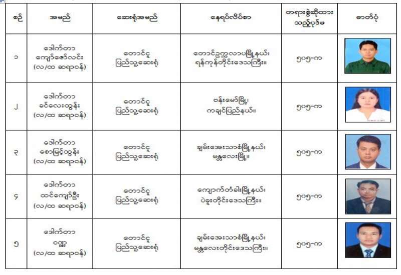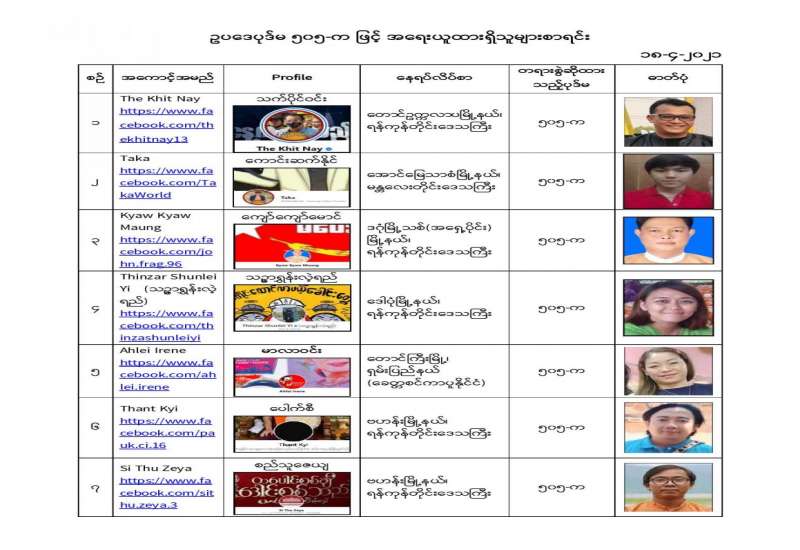 နိုင်ငံတော်၏ အုပ်ချုပ်မှုယန္တရားပျက်ပြားစေရန်ရည်ရွက်ချက်ဖြင့် နိုင်ငံ့ဝန်ထမ်းများအား CDM လှုပ်ရှားမှု တွင် ပါဝင်စေရန်လှုံ့ဆော်ခြင်း၊ CRPH မတရားအသင်းအား ထောက်ခံသည့် အကြောင်းအရာများ၊ မမှန်သတင်းများအားဖြန့်ဝေခြင်း၊ နိုင်ငံတော်တည်ငြိမ်အေးချမ်းမှုကို ပျက်ပြားစေပြီး ဆူပူအုံကြွမှု ဖြစ်ပေါ်စေရန်နှင့် အများပြည်သူအထိတ်တလန့်ဖြစ်စေရန် အတွက် သွေးထိုးလှုံ့ဆော် မှုများပြုလုပ်ခြင်း၊ Social Pumishment ပြုလုပ်ခြင်းများကို လူမှုကွန်ရက် စာမျက်နှာများတွင် ရည်ရွယ်ချက်ရှိရှိ ဖြင့်ဖော်ပြခြင်းနှင့် ဖြန့်ဝေခြင်းများ ဆောင်ရွက် လျက်ရှိသည့် အောက်ဖော်ပြပါ အနုပညာရှင်အချို့နှင့် အခြားပါဝင်ပတ်သက်သူများအား ရာဇသတ်ကြီးပုဒ်မ ၅၀၅-က ဖြင့် အမှုဖွင့်အရေးယူ ဆောင်ရွက် လျက်ရှိပါသည်။