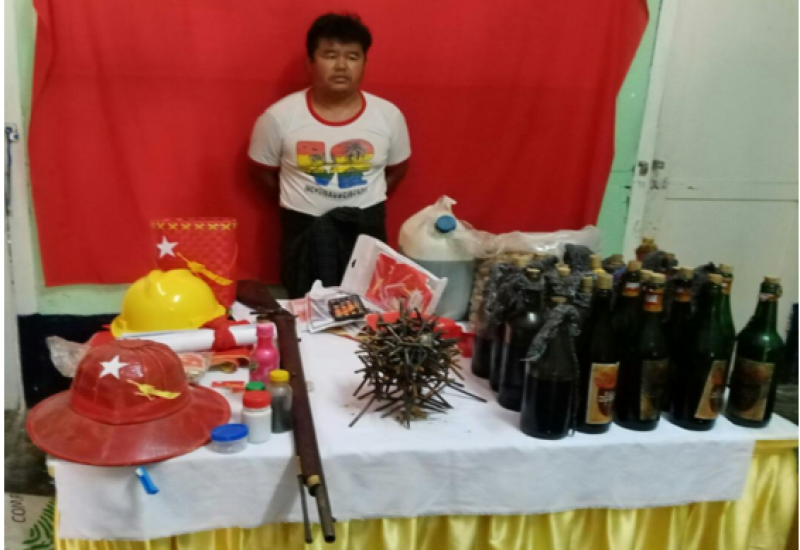 ဆူပူအကြမ်းဖက်သူများအသုံးပြုလျက်ရှိသည့် လက်နက်များနှင့် ပစ္စည်းများ သိုဝှက်ထားမှုနှင့် ကိုင်ဆောင်မှုများကို လုံခြုံရေးတပ်ဖွဲ့ဝင်များက စစ်ဆေးရှာဖွေ သတင်းဖော်ထုတ် ဖမ်းဆီးထိန်းသိမ်းခြင်းများ ဆောင်ရွက်လျက်ရှိရာ အေပြီ ၁၃ ရက် တွင် ညောင်ရွှေမြို့နယ်၊ ညောင်ဖြူကျေးရွာရှိ ဇော်ဝင်းလေး(ခ)ဝေဠု(ဘ)ဦးဝင်းမောင် ၏ နေအိမ်၌ တူမီးသေနတ် ၁ လက်၊ မီးပုလင်း ၂၆ လုံးအခြားဆက်စပ်ပစ္စည်းများအား လည်းကောင်း၊ ဓနုဖြူမြို့၊ မြို့ဝင်စစ်ဆေးရေးဂိတ်၌ လုံခြုံရေးဆောင်ရွက်နေသော ပူးပေါင်း အဖွဲ့က ရန်ကုန်မြို့မှ ကြံခင်းမြို့သို့ ဇော်မျိုးထက်(ဘ)ဦးလှတင် မောင်းနှင်၍ စိုးမင်းဟန် (ဘ)ဦးချစ်လှ လိုက်ပါလာသည့် ရွှေတော်ဝင်မှန်လုံခရီးသည်တင် မော်တော်ယာဉ်အား ရပ်တန့်စစ်ဆေးရာ ယာဉ်ပေါ်ရှိ စက္ကူပုံအတွင်းမှ ဆူပူအကြမ်းဖက်ရာတွင်အသုံးပြုသည့် ပစ္စည်းများ၊ လက်လုပ်ဗုံး ၁ လုံးနှင် ဆက်စပ်ပစ္စည်းများအားလည်းကောင်း ဖမ်းဆီး ရမိခဲ့သည်။