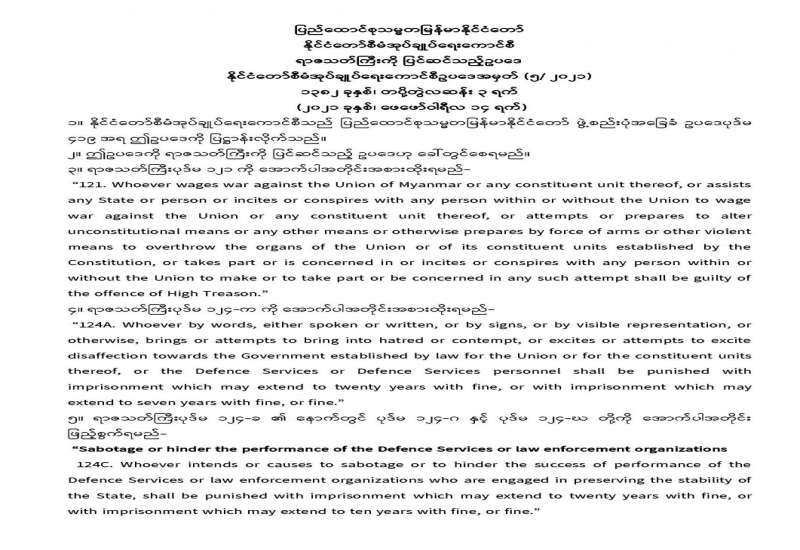 ပြည်ထောင်စုသမ္မတမြန်မာနိုင်ငံတော် နိုင်ငံတော်စီမံအုပ်ချုပ်ရေးကောင်စီ ရာဇသတ်ကြီးကို ပြင်ဆင်သည့်ဥပဒေ နိုင်ငံတော်စီမံအုပ်ချုပ်ရေးကောင်စီဥပဒေအမှတ် (၅/ ၂၀၂၁) ၁၃၈၂ ခုနှစ်၊ တပို့တွဲလဆန်း ၃ ရက် (၂၀၂၁ ခုနှစ်၊ ဖေဖော်ဝါရီလ ၁၄ ရက်)