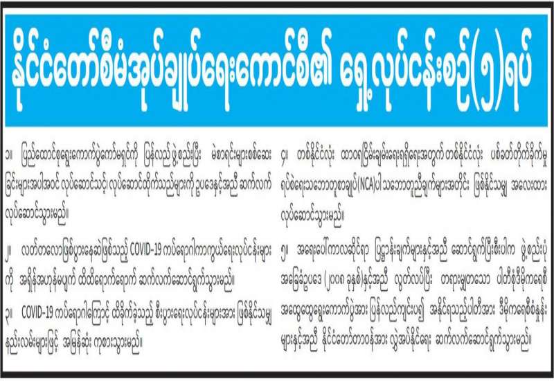 ရန်ကုန်တိုင်းဒေသကြီးအတွင်းရှိ စက်ရုံ၊ အလုပ်ရုံများ အဆင်ပြေချောမွေ့စွာ ပုံမှန် ပြန်လည်လည်ပတ်နိုင်ရေးနှင့် အလုပ်သမားများအတွက် ဥပဒေနှင့်အညီ လုပ်ခလစာပေးချေနိုင် ရေး ညှိနှိုင်းအစည်းအဝေးကို ယနေ့ မွန်းလွဲ (၂) နာရီက အဆိုပါဝန်ကြီးဌာန အစည်းအဝေးခန်းမ၌ ဗီဒီယို ကွန်ဖရင့်စနစ်ဖြင့် ကျင်းပသည်။