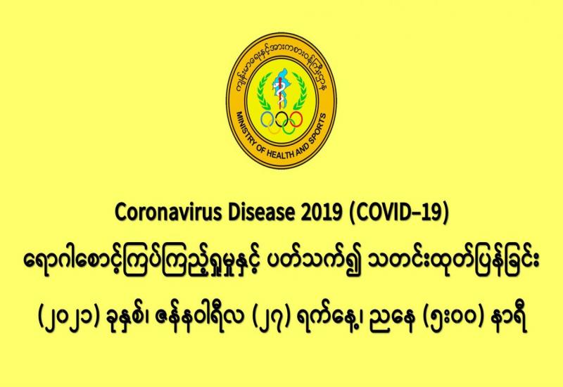 (၂၆-၁-၂၀၂၁)ရက်နေ့၊ ည (၈:၀၀)နာရီမှ (၂၇-၁-၂၀၂၁)ရက်နေ့၊ ည (၈:၀၀)နာရီအတွင်း ဓာတ်ခွဲနမူနာ စုစုပေါင်း (၁၆,၅၅၆)ခုအားစစ်ဆေးပြီးစီးခဲ့ရာ COVID-19 ရောဂါ ာတ်ခွဲအတည် ပြု လူနာသစ် (၄၃၄) ဦး တွေ့ရှိရပါသည်။