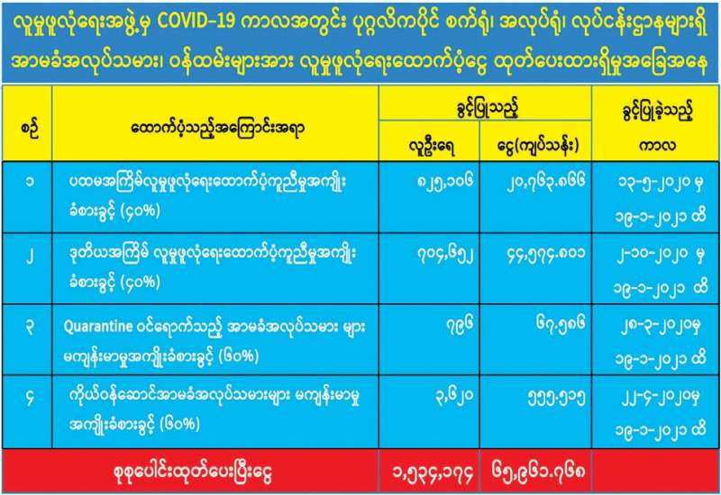 COVID-19 ကာလအတွင်း လူမှုဖူလုံရေးအဖွဲ့မှ လူမှုဖူလုံရေးအကျုံးဝင် ပုဂ္ဂလိကပိုင် စက်ရုံ၊ အလုပ်ရုံ၊ လုပ်ငန်းဌာနများရှိအာမခံအလုပ်သမားများအား လူမှုဖူလုံရေးထောက်ပံ့ငွေများအား ခွင့်ပြုထုတ်ပေးလျက်ရှိရာ COVID-19-19 1st Wave အတွက် ၁၃-၅-၂၀၂၀ရက်နေ့မှ ၁၉-၁-၂၀၂၁ ရက်နေ့အထိ စက်ရုံ၊ အလုပ်ရုံ၊ လုပ်ငန်းဌာန စုစုပေါင်း (၇၂၆၂) ဌာနမှ အာမခံ အလုပ်သမား (၈၂၅,၁၀၆) ဦးအတွက် ထောက်ပံ့ငွေကျပ်သန်း (၂၀,၇၆၃ . ၈၆၆) အား လည်းကောင်း။