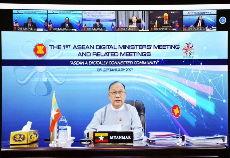 မလေးရှားနိုင်ငံက အလှည့်ကျအိမ်ရှင်အဖြစ် လက်ခံကျင်းပသည့် ပထမအကြိမ် အာဆီယံ ဒီဂျစ်တယ်ဆိုင်ရာ ဝန်ကြီးများအစည်းအဝေးနှင့် ဆက်စပ်အစည်းအဝေးများကို ယနေ့တွင် အွန်လိုင်းစနစ်ဖြင့်ကျင်းပရာ ပို့ဆောင်ရေးနှင့် ဆက်သွယ်ရေးဝန်ကြီးဌာန ပြည်ထောင်စုဝန်ကြီး ဦးသန့်စင်မောင် တက်ရောက်သည်။