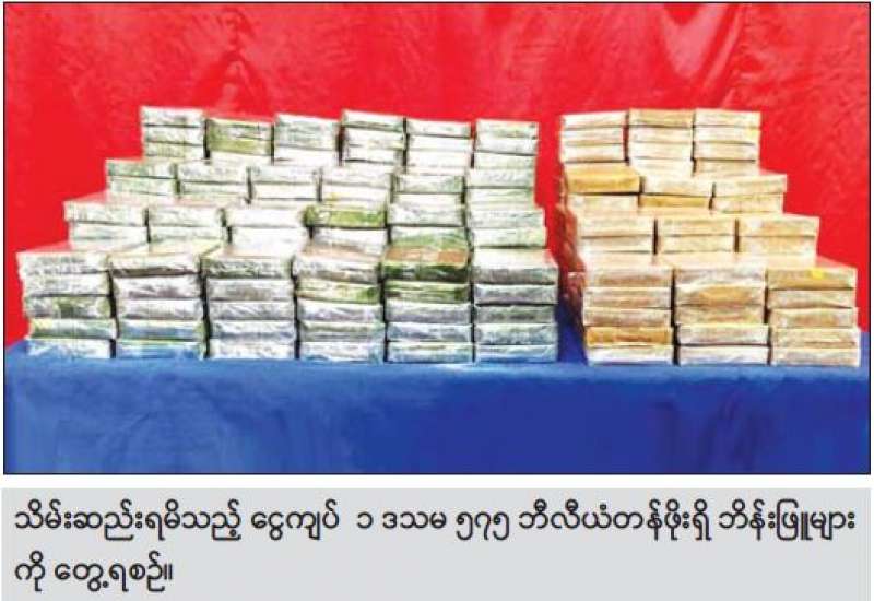 မူးယစ်ဆေးဝါးတားဆီးနှိမ်နင်းရေးရဲတပ်ဖွဲ့မှ တပ်ဖွဲ့ဝင်များပါဝင်သော ပူးပေါင်းအဖွဲ့သည် ဒီဇင်ဘာ ၃၁ ရက်နံနက် ၉ နာရီခွဲတွင် တာချီလိတ်မြို့နယ်၊ ဖန်မင်အုပ်စု၊ ပါဝုန်းကျေးရွာအနီးရှိ လမ်းဘေးလယ်ကွင်းစပ်ရှိ ကောက်ရိုးပုံအောက်တွင် မသင်္ကာဖွယ်အထုပ်များတွေ့ရှိကြောင်း သတင်းအရ သွားရောက်စစ်ဆေးရှာဖွေရာ ငွေကျပ် ၁ ဒသမ ၅၇၅ ဘီလီယံတန်ဖိုးရှိ ဘိန်းဖြူ ၁၀၅ ကီလိုကို လည်းကောင်း။