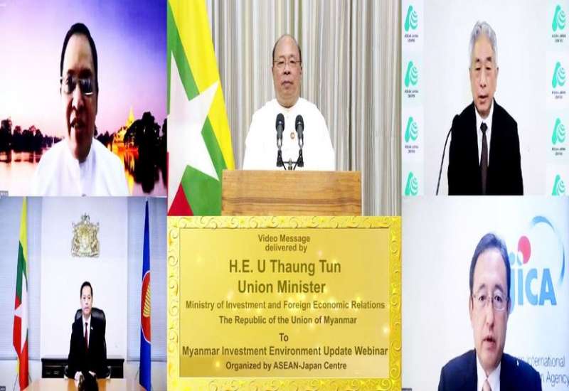 ရင်းနှီးမြှုပ်နှံမှုနှင့် နိုင်ငံခြားစီးပွားဆက်သွယ်ရေးဝန်ကြီးဌာနနှင့် ဂျပန်အပြည်ပြည်ဆိုင်ရာ ပူးပေါင်းဆောင်ရွက်ရေး အေဂျင်စီတို့၏ ကူညီပံ့ပိုးမှု၊ အာဆီယံ-ဂျပန်စင်တာနှင့် မြန်မာသံရုံး (တိုကျိုမြို့)တို့၏ ပူးပေါင်းဆောင်ရွက်မှုတို့ဖြင့် Myanmar Investment Environment Update Webinar ကို ယနေ့နံနက်ပိုင်းတွင် ဂျပန်နိုင်ငံ၌ Virtual စနစ်ဖြင့်ကျင်းပရာ မြန်မာနိုင်ငံ ရင်းနှီးမြှုပ်နှံမှုကော်မရှင်ဥက္ကဋ္ဌ၊ ရင်းနှီးမြှုပ်နှံမှုနှင့် နိုင်ငံခြားစီးပွားဆက်သွယ်ရေးဝန်ကြီးဌာန ပြည်ထောင်စုဝန်ကြီး ဦးသောင်းထွန်း က Video Message ပေးပို့သည်။