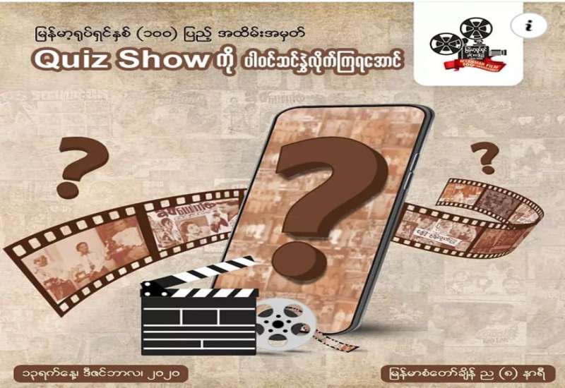 ပြန်ကြားရေးဝန်ကြီးဌာန၊ မြန်မာနိုင်ငံ ရုပ်ရှင်အစည်းအရုံးနှင့် Information Matrix ကုမ္ပဏီတို့ ပူးပေါင်း စီစဉ်ကျင်းပသော မြန်မာ့ရုပ်ရှင်နှစ် (၁၀၀) ပြည့် အထိမ်းအမှတ် အွန်လိုင်းရုပ်ရှင် ပဟေဠိ ပြိုင်ပွဲ (8 PM Quiz Night Show) ကို ဒီဇင်ဘာ ၁၃ ရက်နေ့ ည (၈) နာရီအချိန်တွင် 7Day TV Facebook စာမျက်နှာမှ တစ်ဆင့် တိုက်ရိုက်ထုတ်လွှင့် ကျင်းပမည်ဖြစ်သည်။