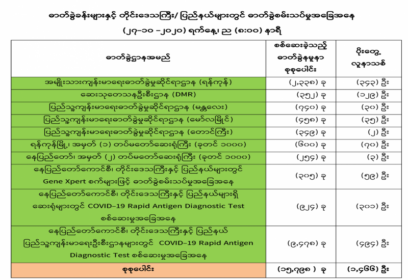 (၂၇-၁၀-၂၀၂၀) ရက်နေ့၊ ည (၈:၀၀) နာရီမှ (၂၈-၁၀-၂၀၂၀) ရက်နေ့၊ ည (၈:၀၀) နာရီ အတွင်း ဓာတ်ခွဲနမူနာ စုစုပေါင်း (၁၄,၂၀၆) ခုအား စစ်ဆေးပြီးစီးခဲ့ရာ COVID-19 ရောဂါ ဓာတ်ခွဲ အတည်ပြု လူနာသစ်(၁,၄၀၆)ဦး တွေ့ရှိရပါသည်။