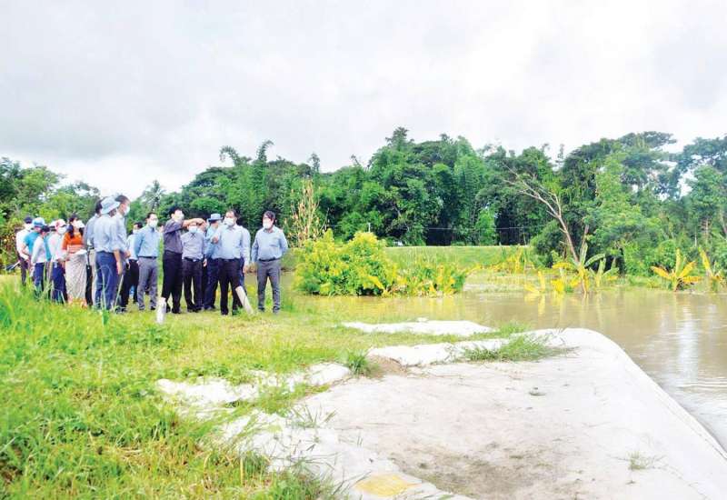 စိုက်ပျိုးရေး၊ မွေးမြူရေးနှင့် ဆည်မြောင်းဝန်ကြီးဌာန ဒုတိယဝန်ကြီး ဦးလှကျော်သည် တာဝန်ရှိသူများနှင့်အတူ ယမန်နေ့ နံနက် ၁၀ နာရီက ဟင်္သာတ ကမ်းနားတာ (အိပ်ပျက်)တွင် တာပုံစံကျ ပြုပြင်ခြင်းလုပ်ငန်းနှင့် ဖြတ်တာသစ်တွင် ရေဝင်ရောက်မှုအခြေအနေများ၊ မြစ်ကမ်း ကာကွယ်ခြင်း လုပ်ငန်း၊ လှိုင်းကာတန်းရိုက်ခြင်းလုပ်ငန်း၊ ကမ်းပြိုကမ်းစားမှု အခြေအနေများကို ကြည့်ရှုစစ်ဆေး သည်။