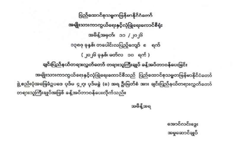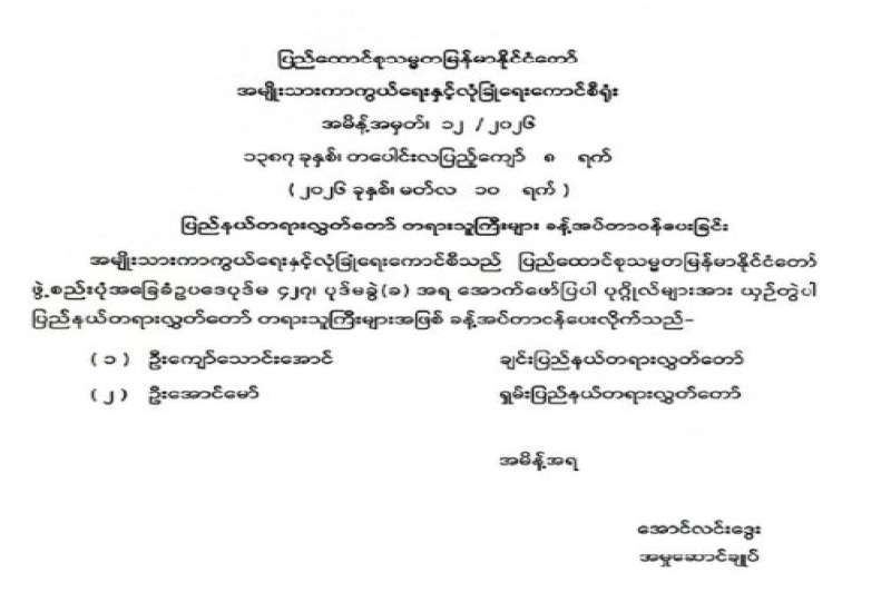 ချင်းပြည်နယ်တရားလွှတ်တော် တရားသူကြီးချုပ် ခန့်အပ်တာဝန်ပေးခြင်း