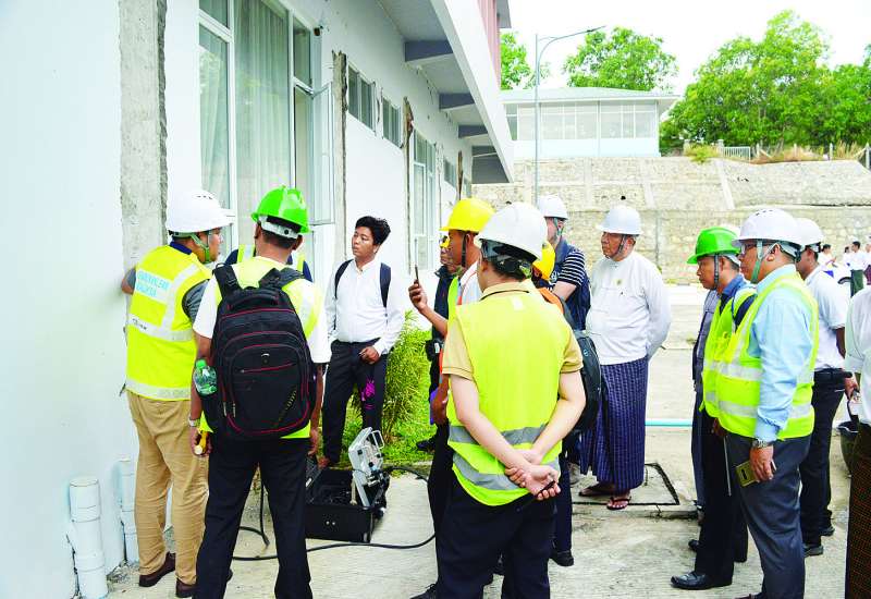 သိပ္ပံနှင့် နည်းပညာဝန်ကြီးဌာန ပြည်ထောင်စုဝန်ကြီး ဒေါက်တာ မျိုးသိန်းကျော်သည် တာဝန်ရှိသူများနှင့်အတူ ယနေ့နံနက်ပိုင်းတွင် မန္တလေးငလျင်ကြီးဒဏ်ကြောင့် အဆောက်အအုံများ ပြိုကျပျက်စီးခြင်းနှင့် ထိခိုက်မှုများဖြစ်ပေါ်ခဲ့ခြင်းအပေါ် မူရင်းမပျက်တိုင်းတာစစ်ဆေးခြင်း အဆင့်မြင့်နည်းပညာများအသုံးပြု၍ အဆောက်အအုံများ၏ကြံ့ခိုင်မှုကို အပြည်ပြည်ဆိုင်ရာ အဏုမြူစွမ်းအင်အေဂျင်စီ(IAEA) မှ ငလျင်သဘာဝဘေး လေ့လာဆန်းစစ်မှုအတွေ့အကြုံရှိ ကျွမ်းကျင်ပညာရှင်လေးဦးနှင့် ပြည်တွင်းပညာရှင်များပါဝင်သောပူးပေါင်းအဖွဲ့က တိုင်းတာစစ်ဆေးနေမှုကို လေ့လာ ကြည့်ရှုသည်။
