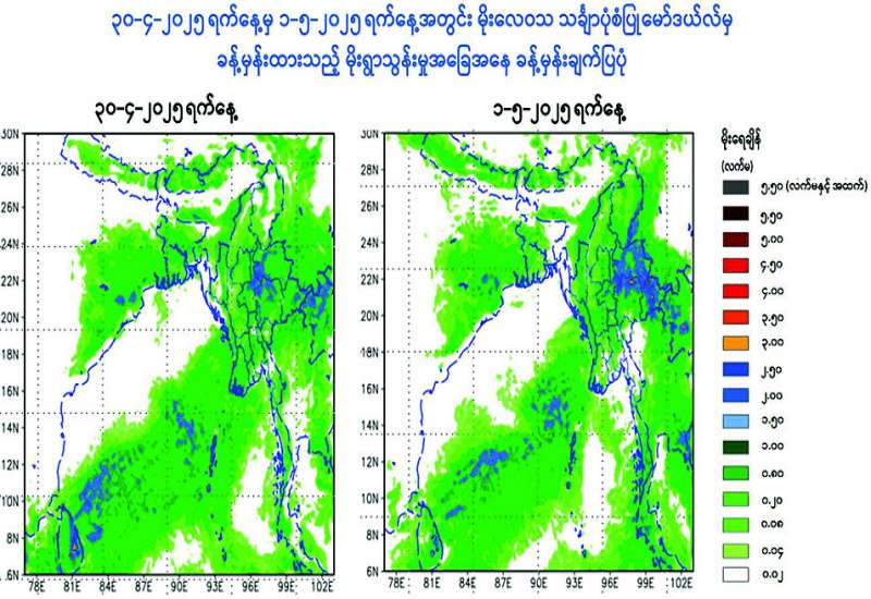 ယနေ့ညနေ ၅ နာရီခွဲ တိုင်းထွာချက်များအရ အနောက်ဘက်မှ ရွေ့လျားလာသော လေပွေလှိုင်းများ၏ အရှိန်ကြောင့်လည်းကောင်း၊ အရှေ့ဘက်မှ ရွေ့လျားလာသော လေပွေလှိုင်းများ၏ အရှိန်ကြောင့်လည်းကောင်း၊ ကပ္ပလီပင်လယ်ပြင်နှင့် ဘင်္ဂလားပင်လယ်အော်တို့မှ လေနွေးများနှင့် တရုတ်ပြည်မကြီးပေါ်ရှိ လေဖိအားကြီးရပ်ဝန်းဒေသမှ ရွေ့လျားလာသော လေအေးများတွေ့ဆုံမှုကြောင့်လည်းကောင်း၊ အပူပြန်တက်တိမ်များ ဖြစ်ထွန်းမှု အားကောင်းခြင်းကြောင့်လည်းကောင်း ယနေ့ညနေမှ မေ ၄ ရက်အတွင်း နေပြည်တော်၊ ရန်ကုန်တိုင်းဒေသကြီး၊ မန္တလေးတိုင်းဒေသကြီး၊ ပဲခူးတိုင်းဒေသ ကြီး၊ မကွေးတိုင်းဒေသကြီး၊ စစ်ကိုင်းတိုင်းဒေသကြီး၊ ဧရာဝတီတိုင်းဒေသကြီး၊ တနင်္သာရီတိုင်းဒေသကြီး၊ ကချင်ပြည်နယ်၊ ကယားပြည်နယ်၊ ကရင်ပြည်နယ်၊ ချင်းပြည်နယ်၊ မွန်ပြည်နယ်၊ ရခိုင်ပြည်နယ်နှင့် ရှမ်းပြည်နယ်တို့တွင် နေရာစိပ်စိပ်မှ နေရာအနှံ့အပြား မိုးထစ်ချုန်းရွာပြီး အချို့ဒေသများတွင် ဒေသအလိုက်နှင့် နေရာကွက်၍ မိုးကြီးနိုင်သည်။