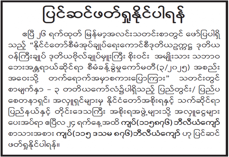 အကြမ်းဖက်အုပ်စုအဖြစ်ကြေညာထားသည့် CRPH I NUG နှင့် ယင်းတို့၏ လက်ဝေခံအဖွဲ့အစည်းများ၊ ယင်းတို့နှင့်ဆက်နွှယ်နေသော အဖွဲ့အစည်းများ၊ လူပုဂ္ဂိုလ်များသည် နိုင်ငံတော်တည်ငြိမ်အေးချမ်းရေးကို ပျက်ပြားစေရန်နှင့် အစိုးရယန္တရားများပျက်ပြားစေရန် ရည်ရွယ်လျက် လှုံ့ဆော်ခြင်း၊ ဝါဒဖြန့်ခြင်းများ ပြုလုပ်ခဲ့မှုအပေါ် ဥပဒေနှင့်အညီ ထိရောက်စွာ အရေးယူသွားမည်ဖြစ်ကြောင်းနှင့် ထိုသို့လှုံ့ဆော်သူ၊ ဝါဒဖြန့်သူများအား ဆက်လက်ဖော်ထုတ်အရေးယူသွားမည်ဖြစ်ကြောင်း မိဘပြည်သူများသိရှိနိုင်ရေး အသိပေးသတင်းထုတ်ပြန်ပြီးဖြစ်သည်။