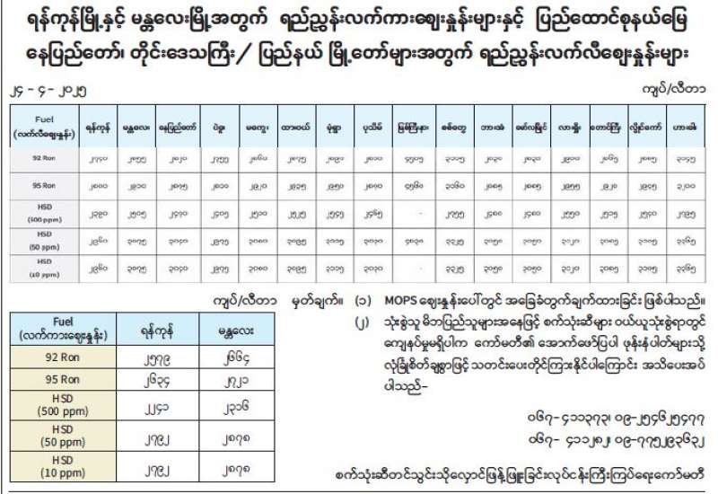 ရန်ကုန်မြို့နှင့် မန္တလေးမြို့အတွက် ရည်ညွှန်းလက်ကားဈေးနှုန်းများနှင့် ပြည်ထောင်စုနယ်မြေ နေပြည်တော်၊ တိုင်းဒေသကြီး/ ပြည်နယ်မြို့တော်များအတွက် ရည်ညွှန်းလက်လီစျေးနှုန်းများ