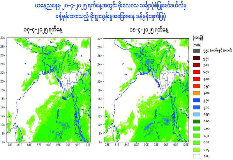 ယနေ့ ညနေ ၅ နာရီခွဲ တိုင်းထွာချက်များအရ အနောက်ဘက်မှ ရွေ့လျားလာသော လေပွေလှိုင်းများ၏ အရှိန်ကြောင့်လည်းကောင်း၊ အရှေ့ဘက်မှ ရွေ့လျားလာသော လေပွေလှိုင်းများ၏ အရှိန်ကြောင့်လည်းကောင်း၊ အပူပြန်တက်တိမ်များ ဖြစ်ထွန်းမှုအားကောင်းခြင်းကြောင့်လည်းကောင်း ယနေ့ညနေမှ ဧပြီ ၂၀ ရက်နေ့အတွင်း နေပြည်တော်၊ မန္တလေးတိုင်းဒေသကြီး၊ ပဲခူးတိုင်းဒေသကြီး၊ မကွေးတိုင်းဒေသကြီး၊ ရခိုင်ပြည်နယ်နှင့် ရှမ်းပြည်နယ်တို့တွင် နေရာကွက်ကျားမှ နေရာကျဲကျဲနှင့် ရန်ကုန်တိုင်းဒေသကြီး၊ စစ်ကိုင်းတိုင်းဒေသကြီး၊ ဧရာဝတီတိုင်းဒေသကြီး၊ တနင်္သာရီတိုင်းဒေသကြီး၊ ကချင်ပြည်နယ်၊ ကယားပြည်နယ်၊ ကရင်ပြည်နယ်၊ ချင်းပြည်နယ်နှင့် မွန်ပြည်နယ်တို့တွင် နေရာစိပ်စိပ်မှ နေရာအနှံ့အပြားမိုးထစ်ချုန်းရွာကာ အချို့ဒေသများတွင် နေရာကွက်၍ မိုးကြီးနိုင်သည်။
