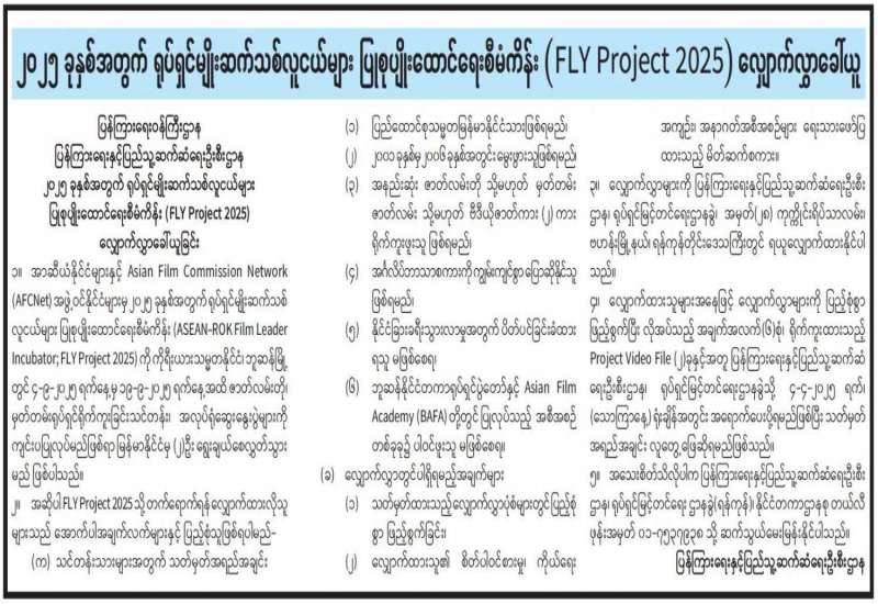၂၀၂၅ ခုနှစ်အတွက် ရုပ်ရှင်မျိုးဆက်သစ်လူငယ်များ ပြုစုပျိုးထောင်ရေးစီမံကိန်း (FLY Project 2025) လျှောက်လွှာခေါ်ယူ