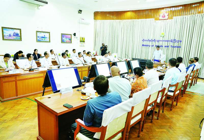 မြန်မာနိုင်ငံရှိ ခရီးစဉ်ဒေသများအား ကမ္ဘာကသိရှိပြီး ပြည်ပခရီးသွားဧည့်သည်များ ပိုမိုတိုးတက်ဝင်ရောက်လာစေရန် ရည်ရွယ်၍ မြန်မာနိုင်ငံခရီးသွားပြပွဲ ၂၀၂၅ (Myanmar Tourism Fair MTF- 2025) ကျင်းပနိုင်ရေးအတွက် ဟိုတယ်နှင့်ခရီးသွားလာရေးဝန်ကြီးဌာန ပြည်ထောင်စုဝန်ကြီး ဦးကျော်စိုးဝင်းသည် မြန်မာနိုင်ငံ ခရီးသွားလုပ်ငန်းအဖွဲ့ချုပ်ဥက္ကဋ္ဌနှင့် ဗဟိုအလုပ်အမှုဆောင်အဖွဲ့ ဝင်များအား ယနေ့မွန်းလွဲပိုင်းတွင် ဝန်ကြီးဌာနရှိ နီလာအစည်းအဝေးခန်းမ၌ တွေ့ဆုံဆွေးနွေးသည်။