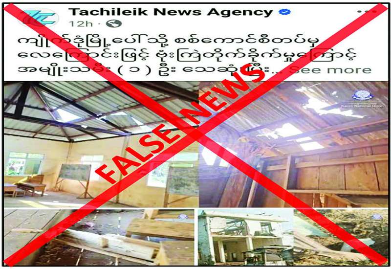 ကရင်ပြည်နယ် ကြာအင်းဆိပ်ကြီးမြို့နယ် ကျိုက်ဒုံမြို့ပေါ်သို့ ဇန်နဝါရီ ၂၃ ရက်တွင် လုံခြုံရေးတပ်ဖွဲ့ဝင်များက လေကြောင်းမှ ဗုံးကြဲတိုက်ခိုက်မှုကြောင့် အမျိုးသမီးတစ်ဦး သေဆုံးပြီး အဆောက်အဦးတချို့ ထိမှန်ပျက်စီးခဲ့ကြောင်း မဟုတ်မမှန်သတင်းများကို တရားမဝင်ပြည်ဖျက်မီဒီယာများက လုပ်ကြံရေးသားဖြန့်ဝေလျက်ရှိကြောင်း တွေ့ရှိရသည်။