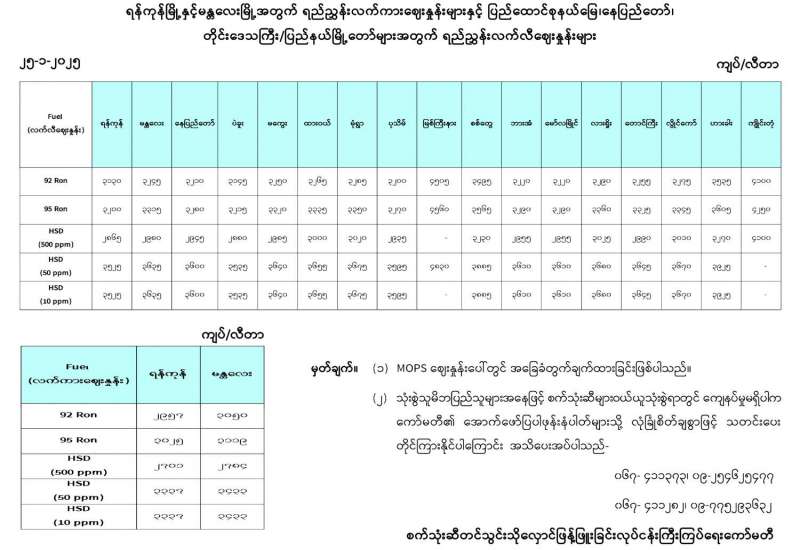 စွမ်းအင်ဝန်ကြီးဌာနအနေဖြင့် ပြည်တွင်းထုတ်ဓာတ်ဆီဖြန့်ဖြူးရောင်းချနေမှု၊ သုံးစွဲမှုနှင့် ပတ်သက်ပြီး ပြည်သူများလေ့လာသိရှိနိုင်ရေးအတွက် “ပြည်သူလူထု၏ သယံဇာတအား ပြည်သူလူထုထံသို့” ဆောင်းပါးအပိုင်း(၁)အား ၂၀၂၅ ခုနှစ်၊ ဇန်နဝါရီလ ၃ ရက် နေ့တွင်လည်းကောင်း၊ အပိုင်း (၂) အား ၂၀၂၅ ခုနှစ်၊ ဇန်နဝါရီလ ၁၅ ရက်နေ့များတွင်လည်းကောင်း နိုင်ငံပိုင်သတင်းစာများမှတစ်ဆင် ပြည်သူများထံသို့ အသိပေးဖော်ပြထားပြီးဖြစ်ပါသည်။ ပြည်တွင်းထုတ်ဓာတ်ဆီကို ပထမအဆင့်အနေဖြင့် နိုင်ငံပိုင်စက်သုံးဆီအရောင်းဆိုင်များဖြစ်သည့် ပြည်ထောင်စုနယ်မြေ နေပြည်တော်တွင် (၁)ဆိုင်၊ မန္တလေးတိုင်းဒေသကြီးတွင် (၂)ဆိုင်၊ စုစုပေါင်း (၃) ဆိုင်တို့အား ၂၀၂၅ ခုနှစ်၊ ဇန်နဝါရီလ ၄ ရက်နေ့မှစတင်၍ တစ်လီတာလျှင် ကျပ် ၂၂၀၀/- နှုန်းဖြင့် မော်တော်ဆိုင်ကယ်နှင့် သုံးဘီးယာဉ်များကိုသာ ဖြန့်ဖြူးရောင်းချပေးလျက်ရှိပါသည်။ ယခုအခါ ပြည်သူများ၏ တောင်းဆိုချက်အရ ဒုတိယအဆင့်အနေဖြင့် RON 68 အသုံးပြုရန် သင့်လျော်သည့် အများပြည်သူပိုင်မော်တော်ယာဉ်များ၊ ဝန်ကြီးဌာနများနှင့် စည်ပင်သာယာရေးအဖွဲ့ပိုင် မော်တော်ယာဉ်များအား ၂၀၂၅ ခုနှစ်၊ ဇန်နဝါရီလ ၂၅ ရက်နေ့မှ စတင်၍ လွတ်လပ်စွာ ဖြန့်ဖြူးရောင်းချပေးသွားမည်ဖြစ်ပါသည်။
