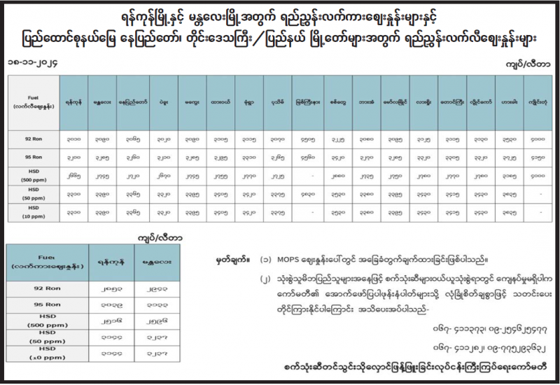 ရန်ကုန်မြို့နှင့် မန္တလေးမြို့အတွက် ရည်ညွှန်းလက်ကားဈေးနှုန်းများနှင့် ပြည်ထောင်စုနယ်မြေ နေပြည်တော်၊ တိုင်းဒေသကြီး/ပြည်နယ် မြို့တော်များအတွက် ရည်ညွှန်းလက်လီဈေးနှုန်းများ