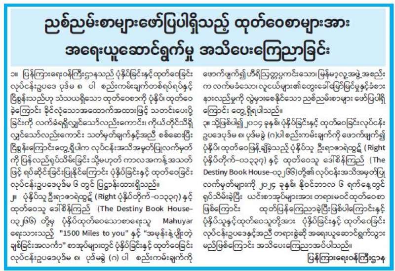 ပြန်ကြားရေးဝန်ကြီးဌာနသည် ပုံနှိပ်ခြင်းနှင့်ထုတ်ဝေခြင်းလုပ်ငန်းဥပဒေ၊ နည်းဥပဒေများနှင့်အညီပုံနှိပ်ခြင်းလုပ်ငန်း၊ ထုတ်ဝေခြင်းလုပ်ငန်းများကို ကြီးကြပ်ဆောင်ရွက်လျက်ရှိပါသည်။