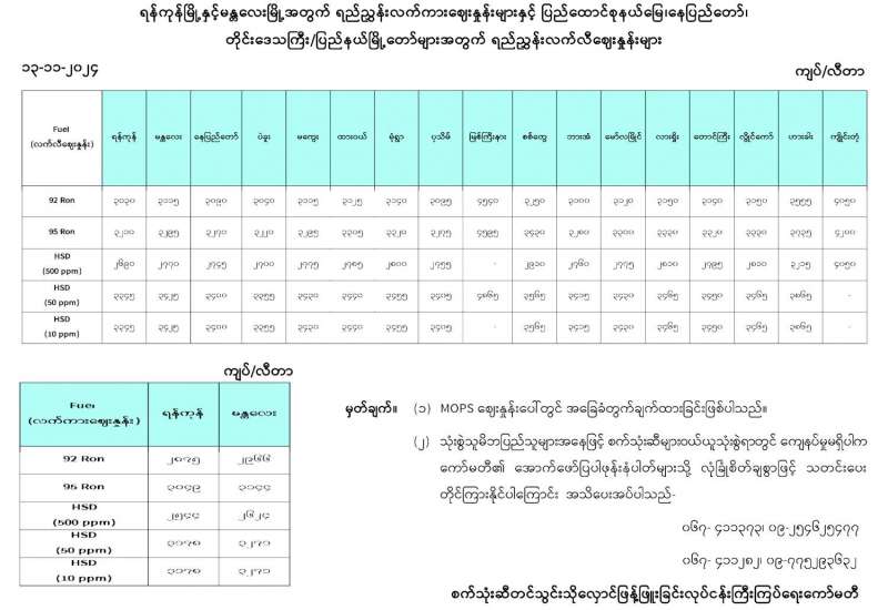 ရန်ကုန်မြို့နှင့် မန္တလေးမြို့အတွက် ရည်ညွှန်းလက်ကားဈေးနှုန်းများနှင့် ပြည်ထောင်စုနယ်မြေ နေပြည်တော်၊ တိုင်းဒေသကြီး/ပြည်နယ် မြို့တော်များအတွက် ရည်ညွှန်းလက်လီဈေးနှုန်းများ