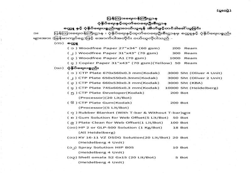 စက္ကူ နှင့် ပုံနှိပ်ရေးပစ္စည်းများဝယ်ယူရန် အိတ်ဖွင့်တင်ဒါခေါ်ယူခြင်း