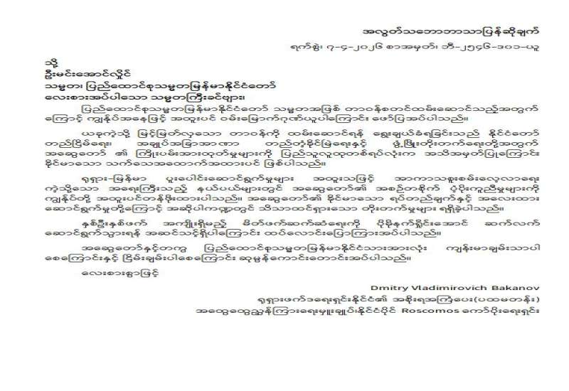 ပြည်ထောင်စုသမ္မတမြန်မာနိုင်ငံတော်၊ ရွေးကောက်တင်မြှောက်ခြင်းခံရသော သမ္မတ၊ နိုင်ငံတော်လုံခြုံရေးနှင့်အေးချမ်းသာယာရေးကော်မရှင်ဥက္ကဋ္ဌ ဗိုလ်ချုပ်မှူးကြီး မင်းအောင်လှိုင်ထံသို့ ရုရှားဖက်ဒရေးရှင်းနိုင်ငံ၏ အစိုးရအကြံပေး (ပထမတန်း) နိုင်ငံပိုင် Roscomos ကော်ပိုးရေးရှင်း အထွေထွေညွှန်ကြားရေးမှူးချုပ် Dmitry Vladimirovich Bakanov ထံမှ ဝမ်းမြောက်ကြောင်း သဝဏ်လွှာပေးပို့