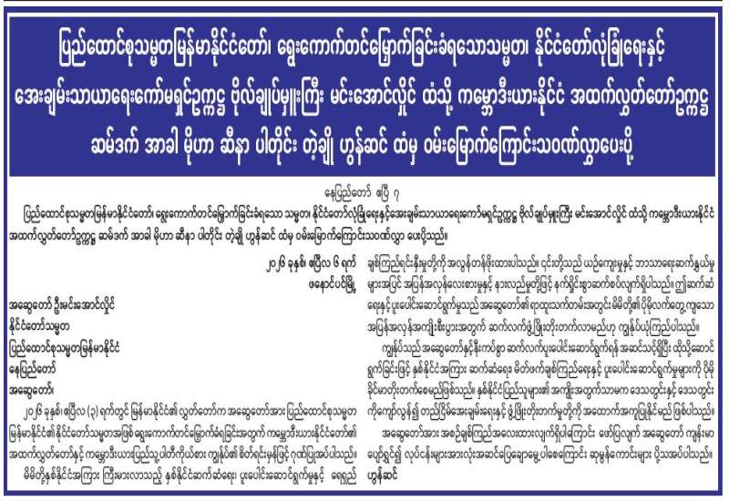 ပြည်ထောင်စုသမ္မတမြန်မာနိုင်ငံတော်၊ ရွေးကောက်တင်မြှောက်ခြင်းခံရသောသမ္မတ၊ နိုင်ငံတော်လုံခြုံရေးနှင့်အေးချမ်းသာယာရေးကော်မရှင်ဥက္ကဋ္ဌ ဗိုလ်ချုပ်မှူးကြီး မင်းအောင်လှိုင်ထံသို့ ကမ္ဘောဒီးယားနိုင်ငံ အထက်လွှတ်တော်ဥက္ကဋ္ဌ ဆမ်ဒက် အာခါ မိုဟာ ဆီနာ ပါတိုင်း တဲ့ချို ဟွန်ဆင်ထံမှ ဝမ်းမြောက်ကြောင်းသဝဏ်လွှာပေးပို့
