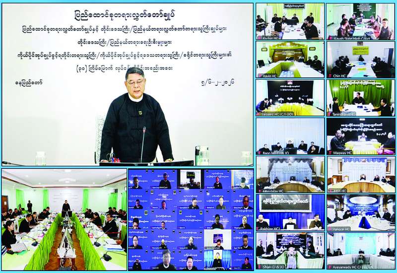 ပြည်ထောင်စုတရားလွှတ်တော်ချုပ်နှင့် တိုင်းဒေသကြီး၊ ပြည်နယ်တရားလွှတ်တော်များ၊ ကိုယ်ပိုင်အုပ်ချုပ်ခွင့်ရ တိုင်းတရားရုံး၊ ကိုယ်ပိုင်အုပ်ချုပ်ခွင့်ရ ဒေသတရားရုံး၊ ခရိုင်တရားရုံးများ၏ အကြိမ် (၃၀)မြောက် ညှိနှိုင်းအစည်းအဝေးကို ယနေ့နံနက် ၉ နာရီတွင် နေပြည်တော်ရှိ ပြည်ထောင်စု တရားလွှတ်တော်ချုပ်၌ ဗီဒီယိုကွန်ဖရင့်စနစ်ဖြင့်ကျင်းပရာ ပြည်ထောင်စုတရား သူကြီးချုပ်ဦးသာဌေး အမှာစကား ပြောကြားသည်။