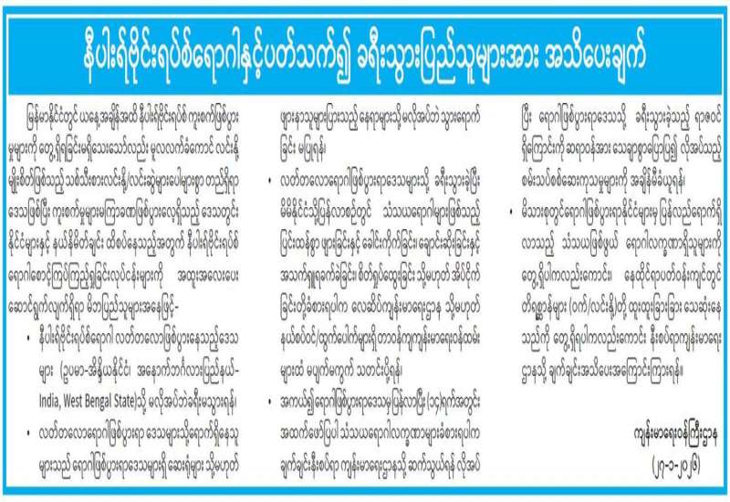 နီပါးရ်ဗိုင်းရပ်စ်ရောဂါနှင့်ပတ်သက်၍ ခရီးသွားပြည်သူများအား အသိပေးချက်